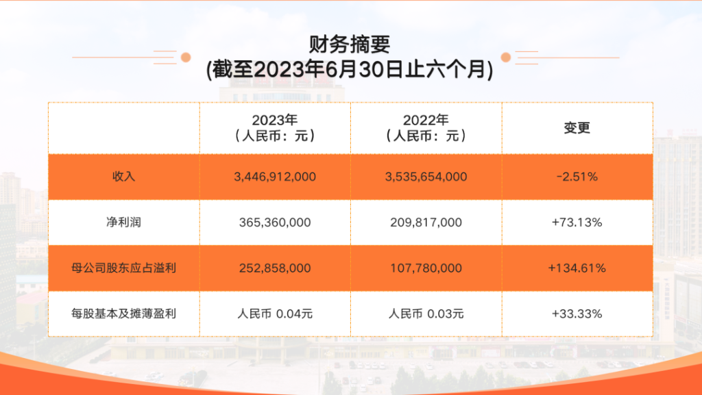 2023年上半年,面對嚴(yán)峻復(fù)雜的內(nèi)外部發(fā)展環(huán)境以及金價高位運行的歷史機遇,招金礦業(yè)不斷提升風(fēng)險預(yù)判能力,適時把握市場機遇,有效化解各種風(fēng)險和挑戰(zhàn),取得了來之不易的發(fā)展成績。2023年上半年,招金礦業(yè)實現(xiàn)營業(yè)收入約人民幣34.47億元,較去年同期總體保持平穩(wěn);凈利潤增長約74.13%至約人民幣365,360,000元,母公司股東應(yīng)占溢利增長約134.61%至約人民幣252,858,000 元,母公司普通股股東應(yīng)占每股基本及攤薄盈利增長約33.33%至約人民幣0.04 元。
