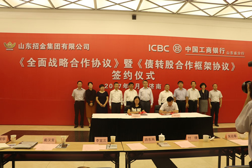 9月19日,山東招金集團(tuán)與中國(guó)工商銀行山東分行在山東濟(jì)南簽訂了《全面戰(zhàn)略合作協(xié)議》暨《債轉(zhuǎn)股合作框架協(xié)議》。招金集團(tuán)董事長(zhǎng)路東尚,副總經(jīng)理李宜三、招金礦業(yè)財(cái)務(wù)總監(jiān)戴漢寶、招金財(cái)務(wù)公司總經(jīng)理曲麗華;工行山東省分行行長(zhǎng)付捷、副行長(zhǎng)吳迎春、工銀金融資產(chǎn)投資公司投資一部總經(jīng)理陳國(guó)立以及山東分行金融業(yè)務(wù)部、信貸與投資管理部、授信審批部、煙臺(tái)分行等相關(guān)人員出席簽約儀式。