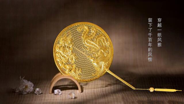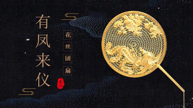 采金為絲,妙手編結(jié)。有鳳來儀花絲團扇以金絲為材質(zhì),采用傳承百年的宮廷技藝--花絲鑲嵌工藝精制而成?;ńz鑲嵌工藝于2008年被列入國家非物質(zhì)文化遺產(chǎn)名錄,技藝繁復(fù)細膩,成品華麗精美。有鳳來儀花絲團扇以圓形為輪廓,寓意著團圓和美,喜結(jié)善緣,好事圓滿。一根根花絲掐成云頭紋樣式,堆壘攢焊在一起,配以鳳凰、牡丹做裝飾,完美的詮釋了國色天香、雍容華貴的氣質(zhì)。