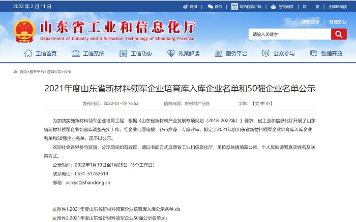 近日,山東省工業(yè)和信息化廳下發(fā)了《關(guān)于公布2021年度山東省新材料領(lǐng)軍企業(yè)培育庫(kù)入庫(kù)名單和50強(qiáng)名單的通知