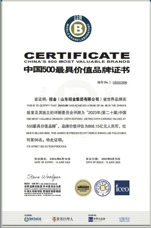 2023年中國(guó)500最具價(jià)值品牌榜單發(fā)布——招金集團(tuán)以868.15億元品牌價(jià)值位列第96位